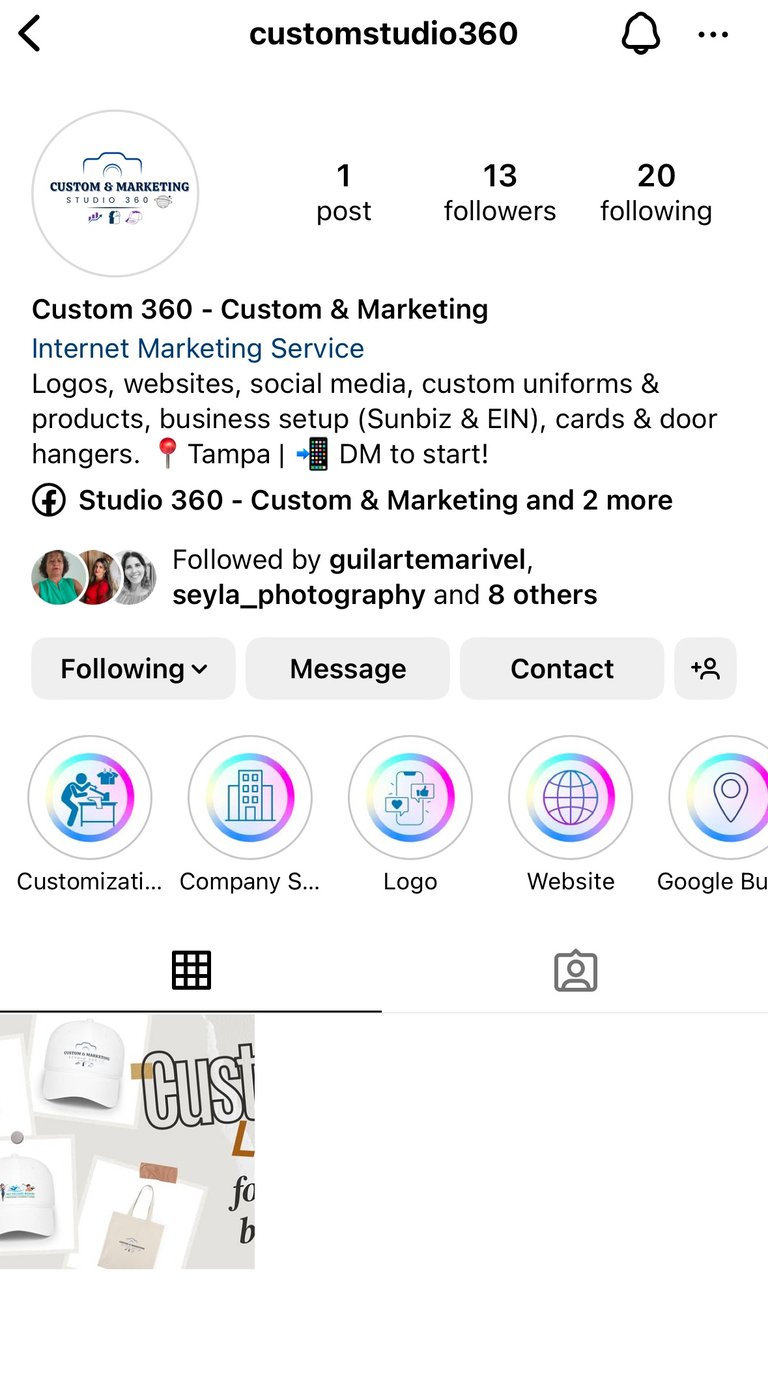 En Studio 360 Custom & Marketing, ubicado en Tampa, Florida, nos especializamos en crear identidades de marca completas y profesionales que generan impacto. Nuestros servicios incluyen diseño de logotipos memorables, desarrollo de sitios web responsivos y optimizados para SEO, gestión estratégica de redes sociales (Instagram, Facebook), así como la personalización de uniformes y productos promocionales como camisetas, tazas, stickers y tarjetas. Cada solución está pensada para transmitir consistencia, profesionalismo y un branding único que conecta con tu audiencia y fortalece la presencia de tu negocio en el mercado local.